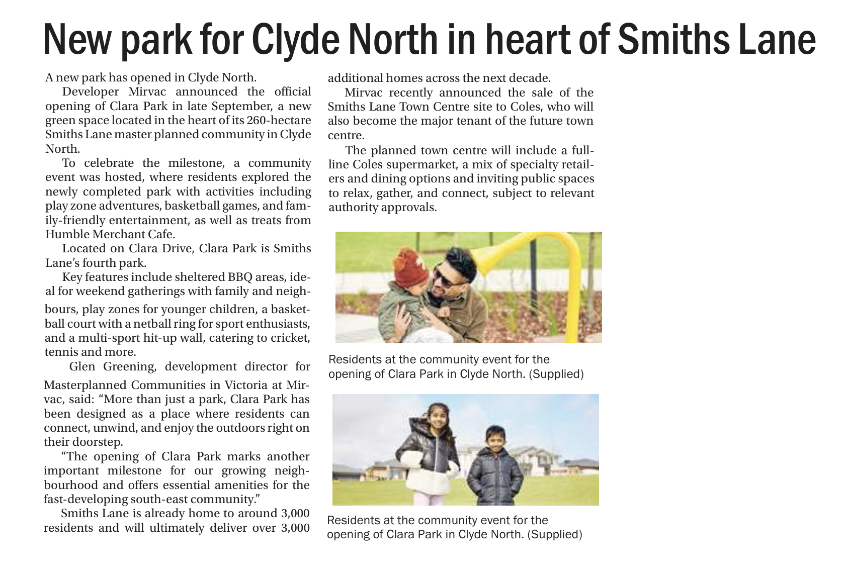 The article celebrates Clara Park as a vibrant community destination — a place where families gather, children play, and neighbours connect. This tree-filled park promises to be a fantastic addition to our community.
